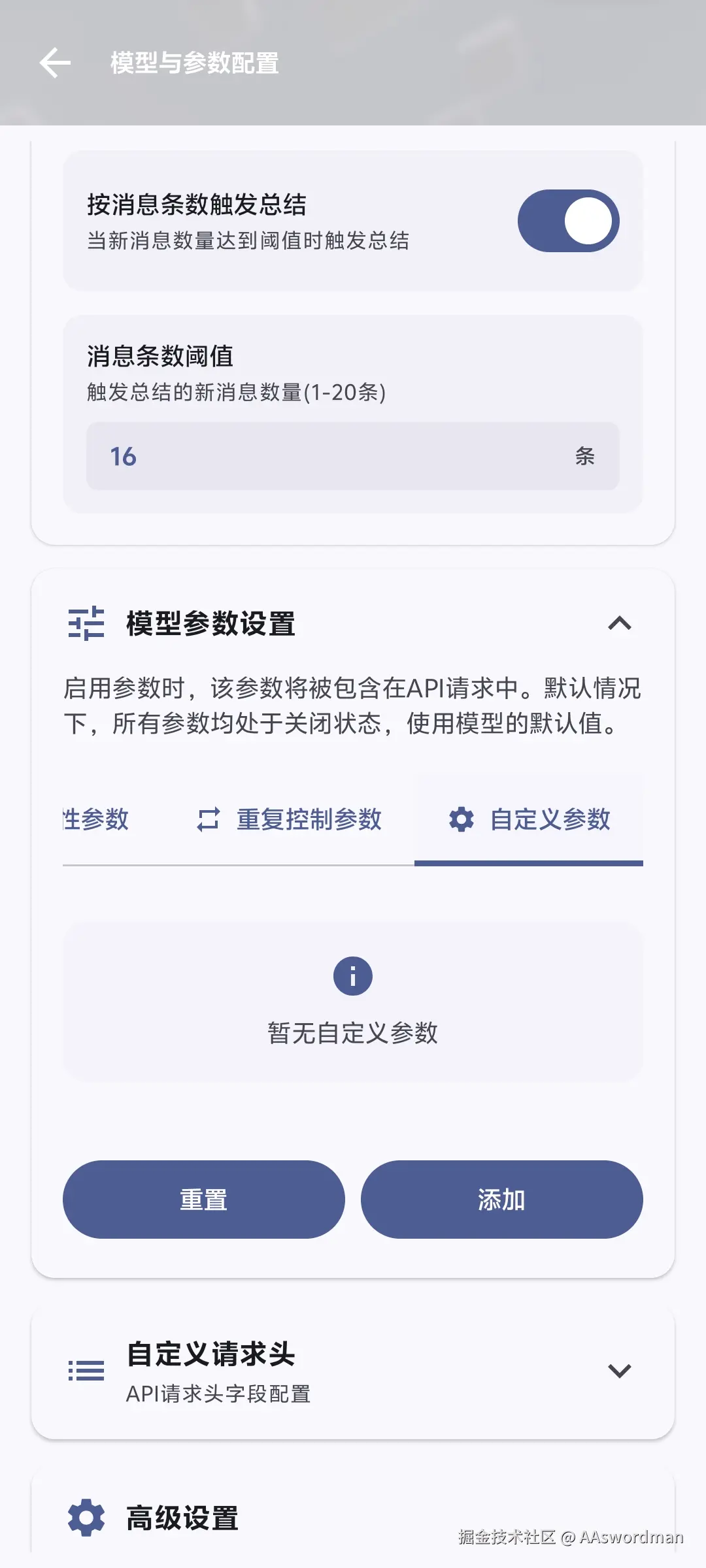 总结设置就很一目了然了,一个按照消息总结,一个按照阈值总结。当然这个都是自动总结,如果想要手动,可以参考上一篇界面介绍里面的,长按消息,有个插入总结的选项能用。可以插入到聊天的任意位置。