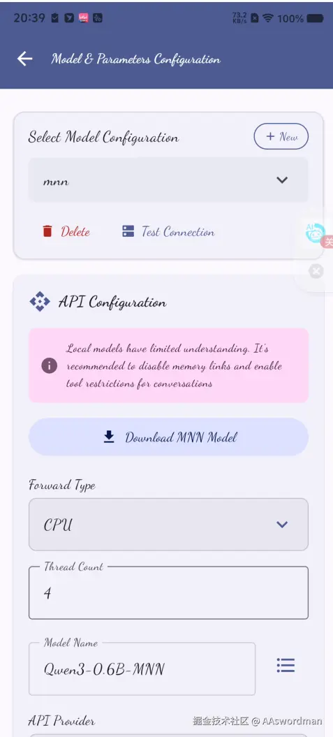 只要将api供应商选择为llama或者mnn即可。mnn我们提供了下载途径,llama需要自备模型。
