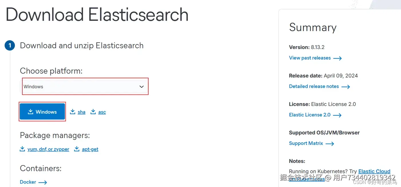 一、Windows 安装ElasticSearch7.8 下载地址:ElasticSearch 7.8下载地址 ,点击进入下载界面后根据自身的操作系统选择对应的版本进行下载即可