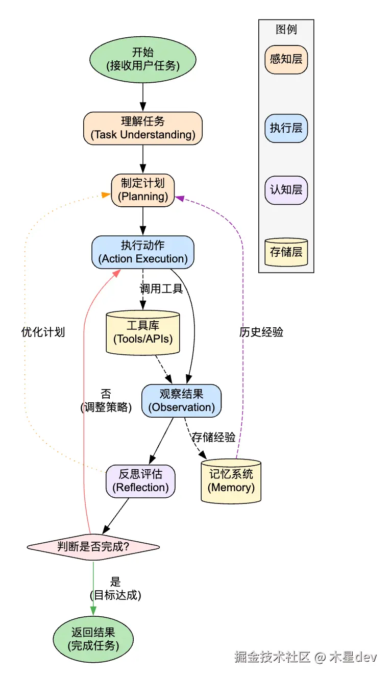 - 感知 → 思考 → 行动 → 感知 → ……