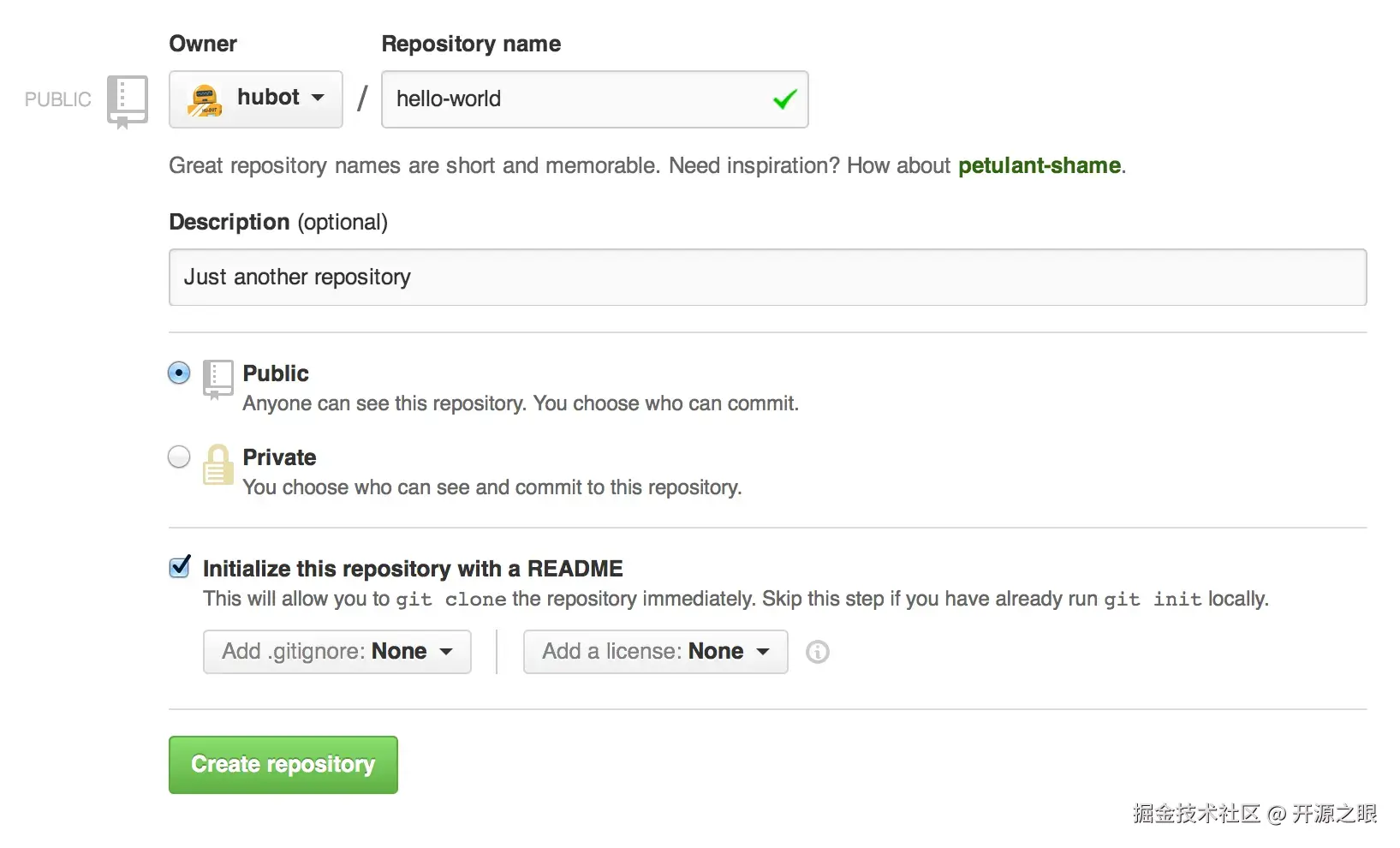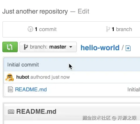 仓库通常用于组织单个项目,仓库可以包含文件夹和文件,图像,视频,电子表格和数据集-项目需要的任何内容。我们建议包含自述文件或有关您的项目信息的文件。下面我们创建一个hello-world仓库,可以用来你记录想法,保存资源。