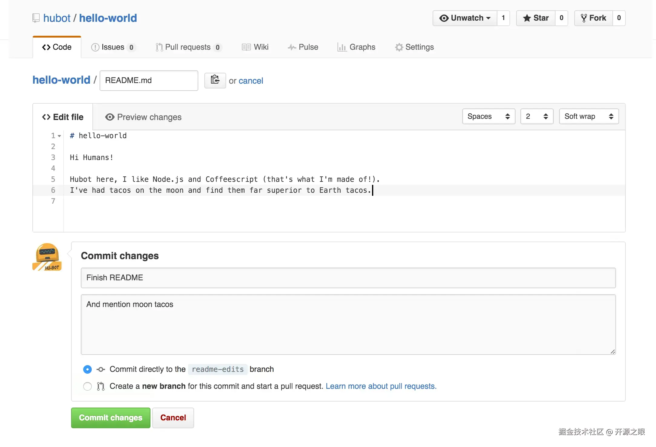 这些更改将仅针对readme-edits分支上的README文件进行编辑,因此现在该分支包含的内容与master分支有所不同。