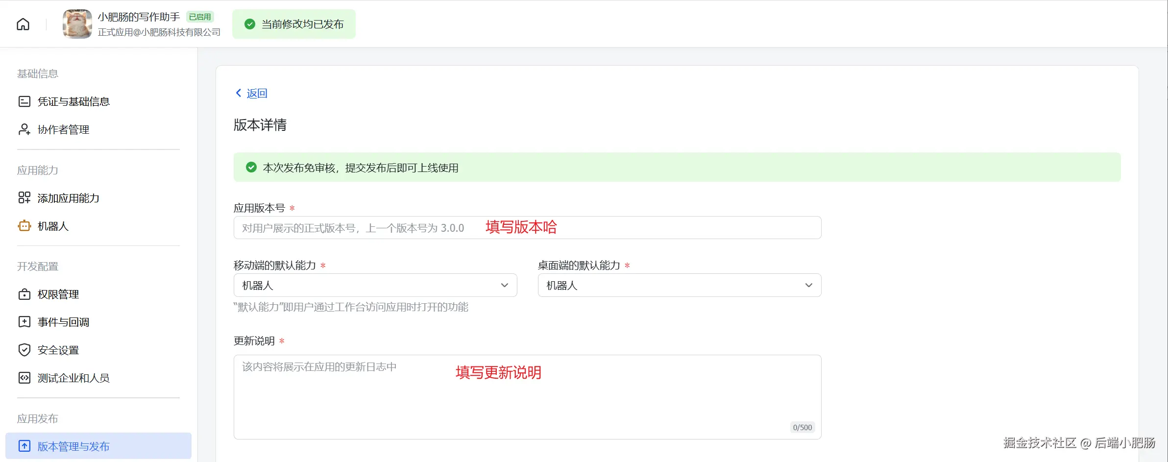 发布新版本: 填写版本号和更新说明后直接发布。