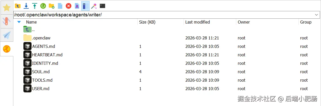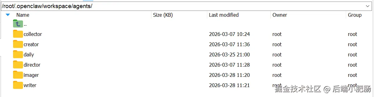飞书 bot 建好了,接下来要在 OpenClaw 这边把对应的 Agent 配起来。首先进入 /root/.openclaw/workspace/ Agent s/ 目录,给每个 Agent 新建一个文件夹。文件夹名就是这个 Agent 的 id。比如我这边跑了三个 Agent ——日常助手、写作助手、生图助手,对应建了 daily、writer、imager 三个文件夹。 (ps:director、writer、imager是小红书运营Agent,文章指引:OpenClaw 实战|多 Agent 打通小红书:数据收集 + 笔记编写 + 自动发布一步到位)