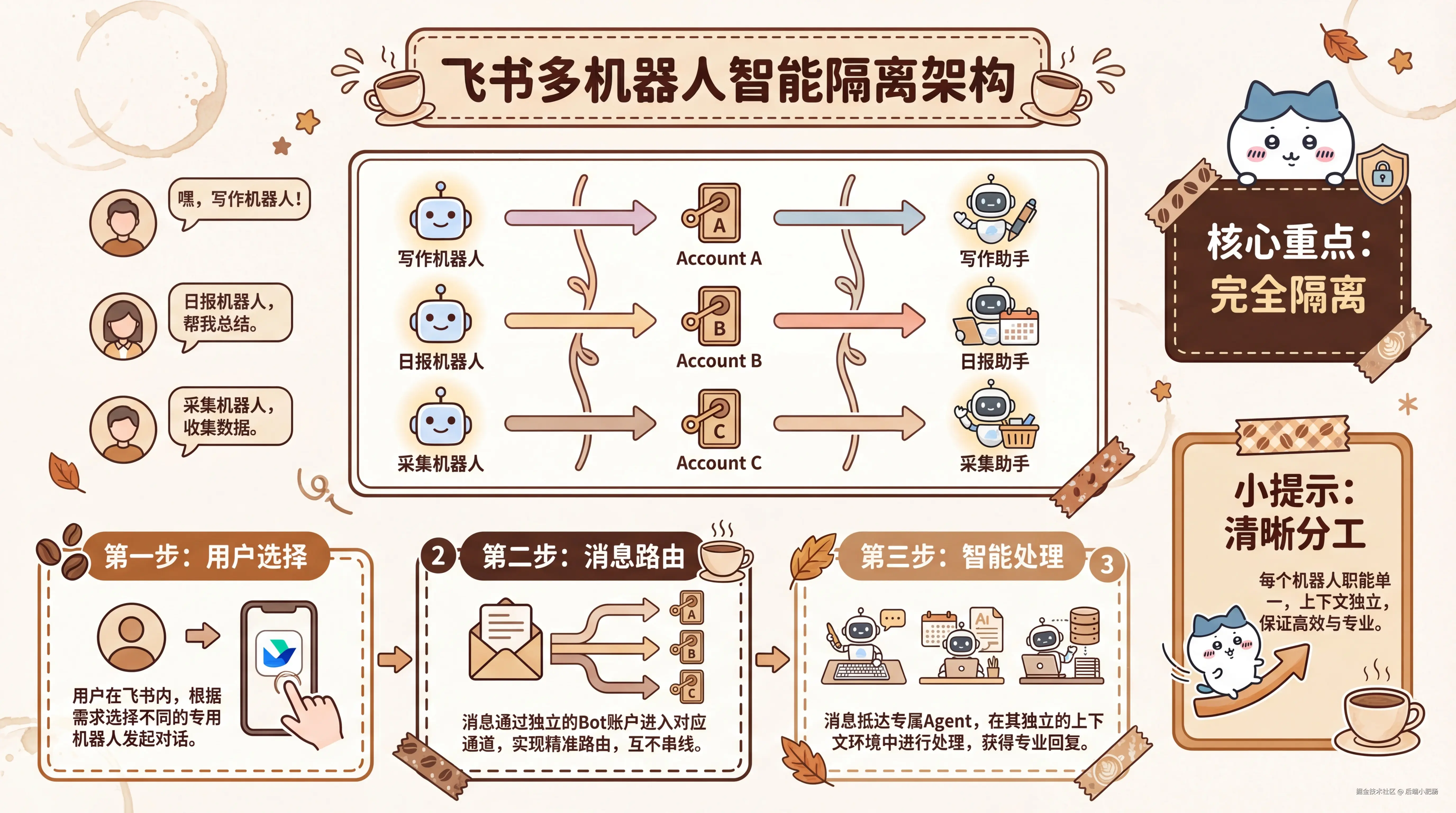 从一个 bot 打天下,到每个 Agent 都有专属入口,这个改造成本不高,但带来的提升是实实在在的——上下文干净了,任务不再串戏,稳定性也好了很多。