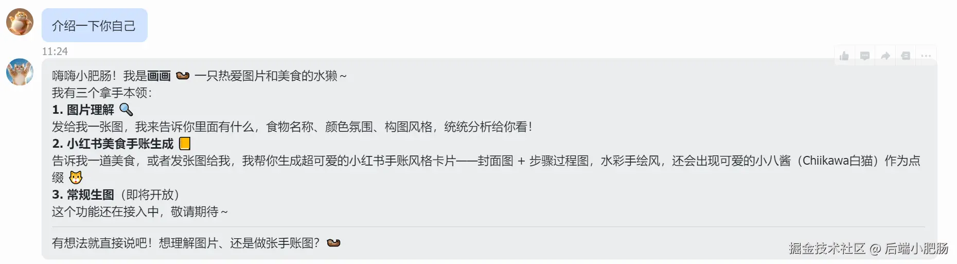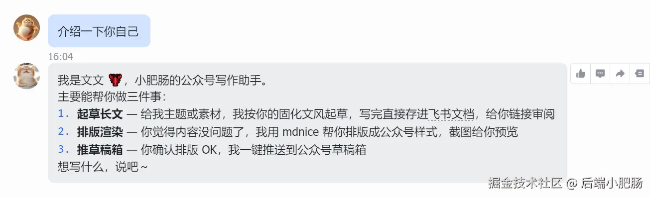 📋 日常助手(daily) :全能助理,日报、提醒、日常问答都归它管,每天晚上还会自动推送日报,是我用得最频繁的 Agent。 🖊️ 写作助手(writer) :公众号专属写手,按我固化的文风起草长文,写完存进飞书文档给我审阅,确认后排版推草稿箱,全程不用我动手。 🎨 生图助手(imager) :视觉担当,支持图片理解、小红书美食手账生成,全能生图(skill正在开发),把我的想法变成好看的图。