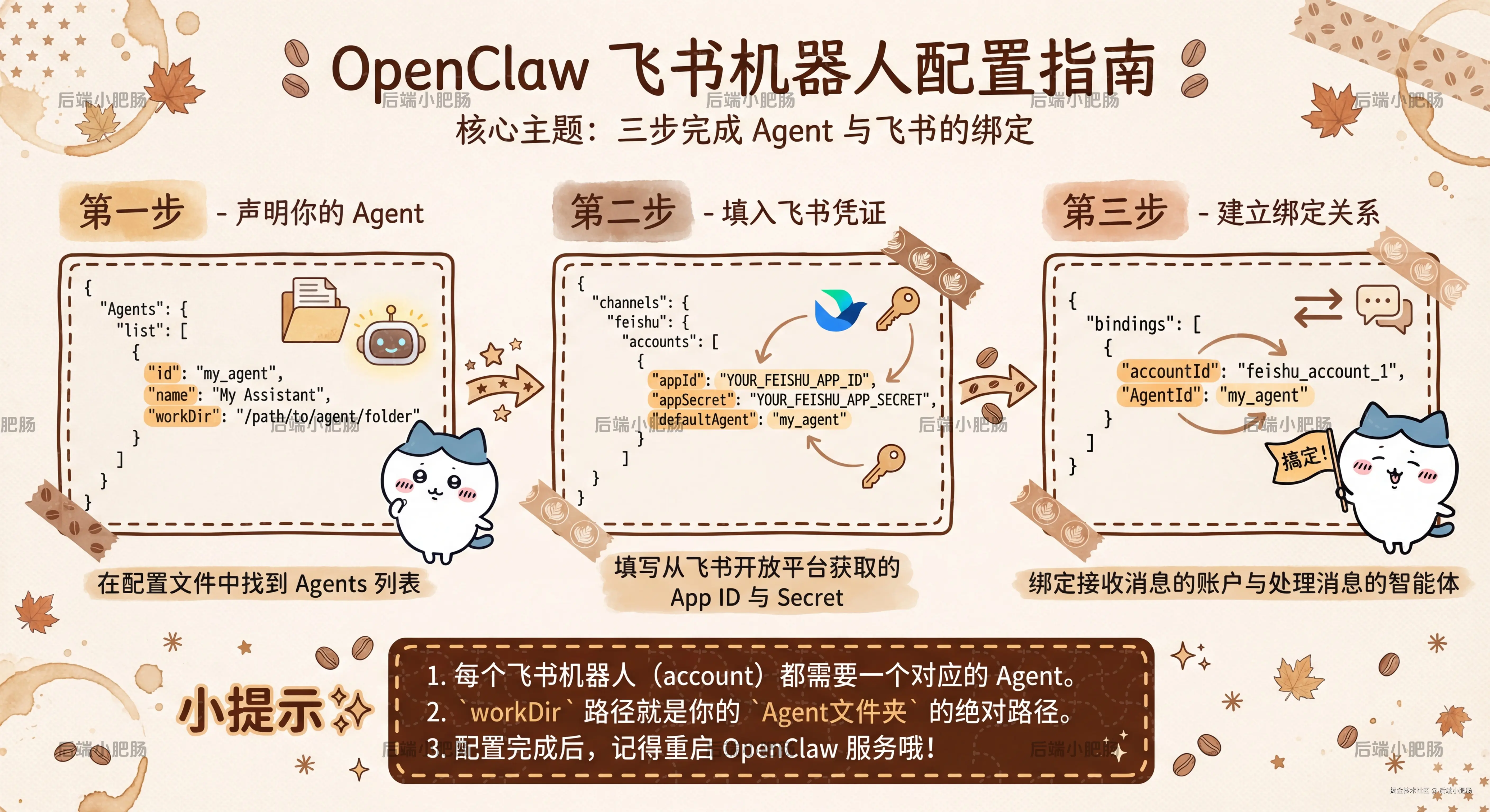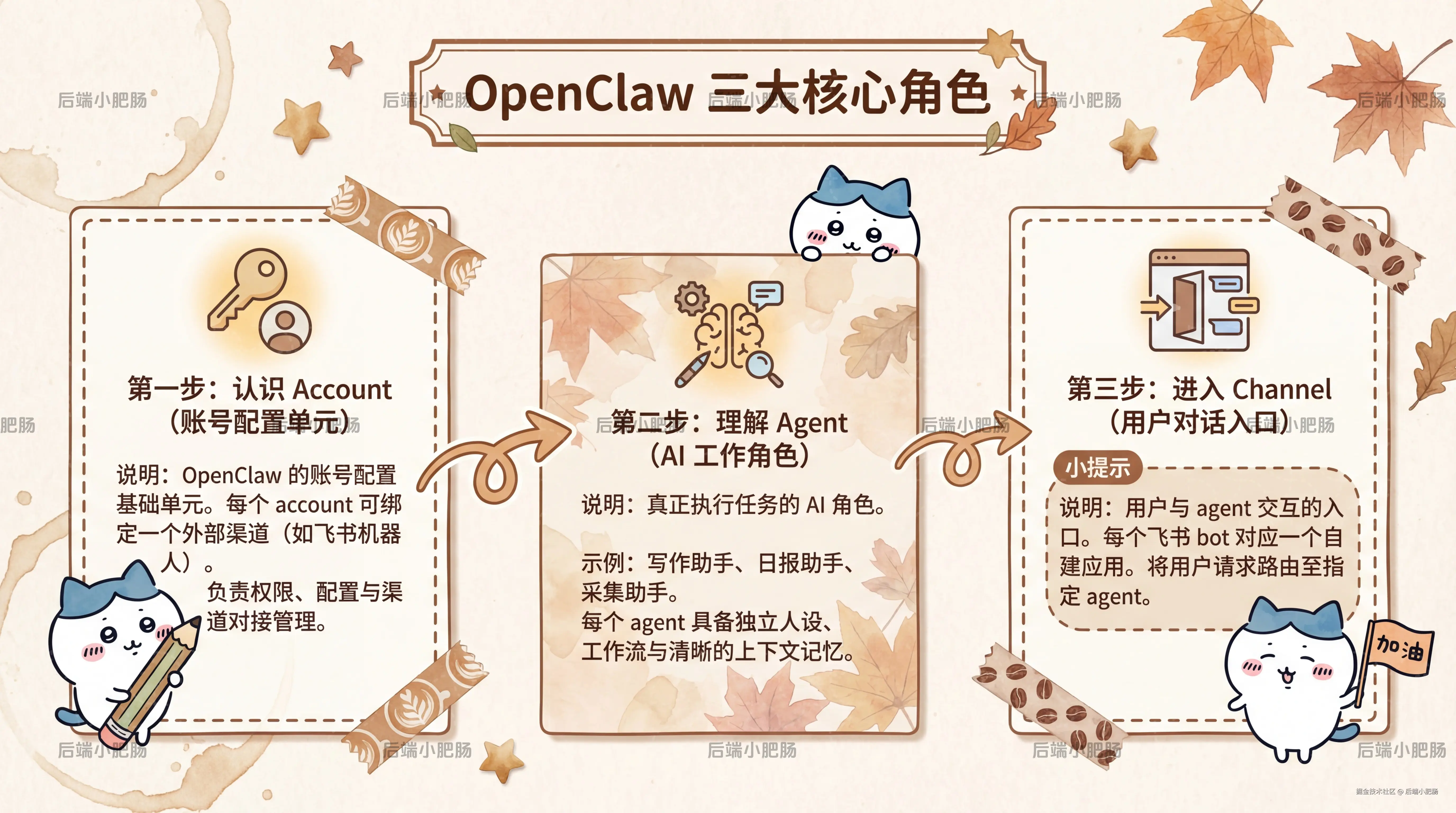 在动手之前,先把几个核心概念搞清楚,OpenClaw 里有三个关键角色:account、 Agent 、 channel。