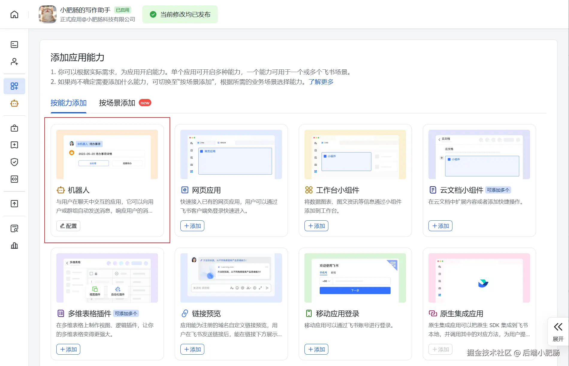 添加应用能力: 进入【添加应用能力】页面,找到机器人卡片,点击【添加】按钮。