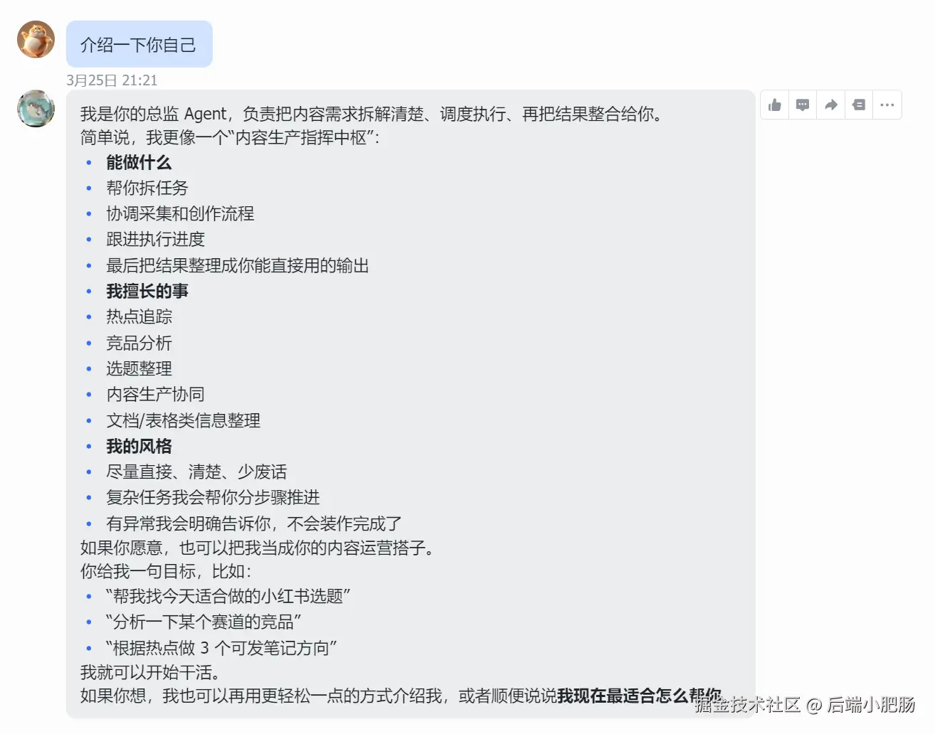- ✍️ 创作者(creator) :内容生产机器,拿到采集员送来的素材,负责创作小红书笔记,文案、排版一条龙。