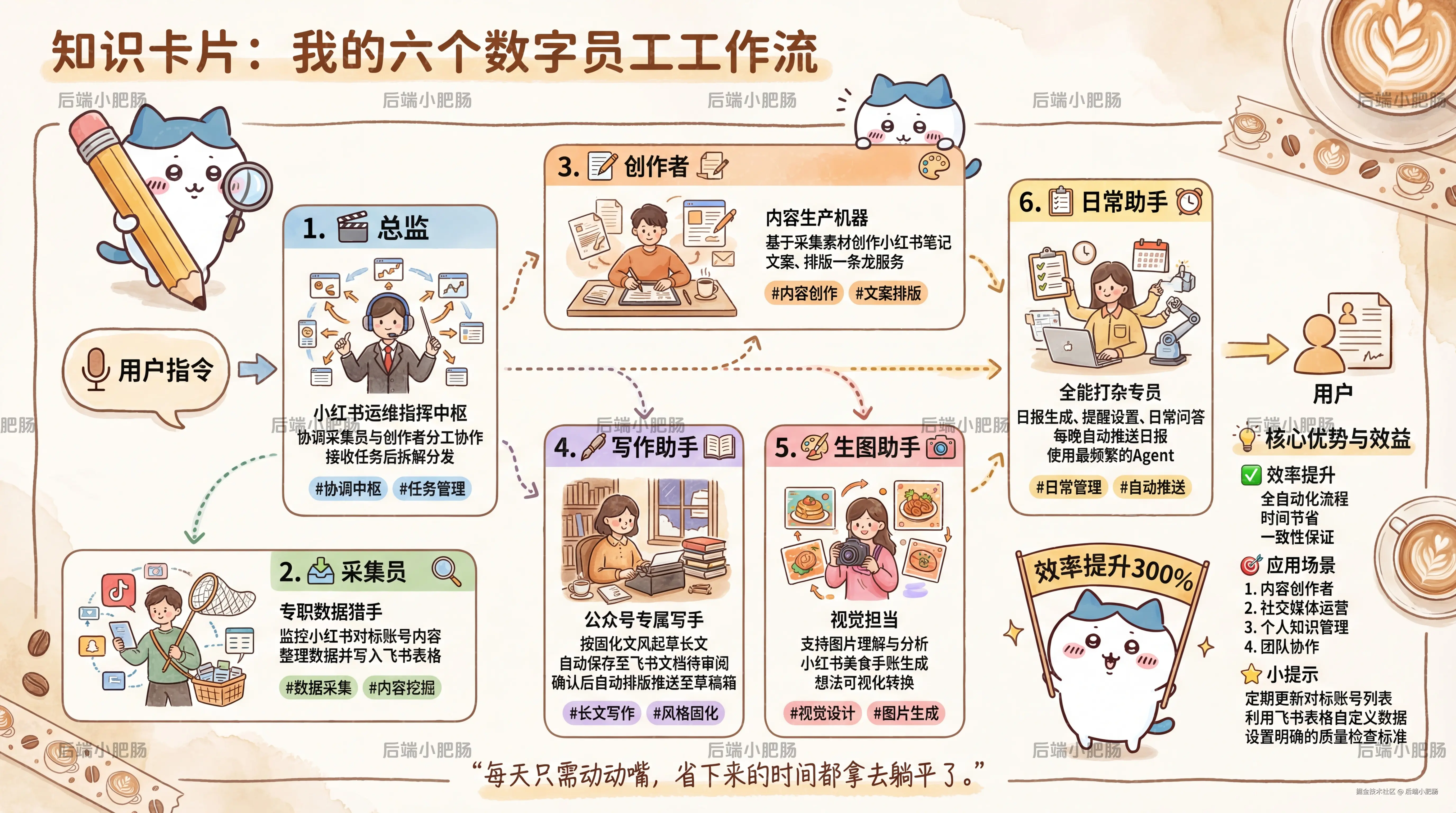有了这六个 Agent,我每天只需要动动嘴,采集、写稿、出图、日报全自动跑,省下来的时间可以做一些别的事情。