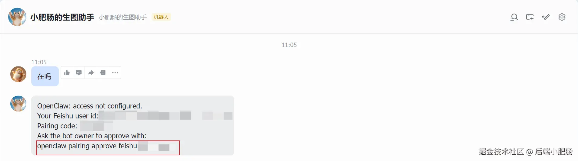 openclaw配对: 第一次与飞书bot对话会出现让配对的标识,只需将红框部分发送给openclaw管理后台配对即可。(注意如果是本机就打开命令行输入指令,服务器就进入命令行面板)