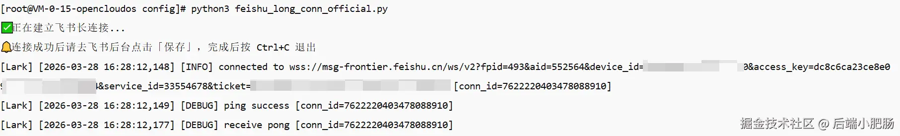 输入命令python3 feishu_long_conn_official.py启动临时长链接。