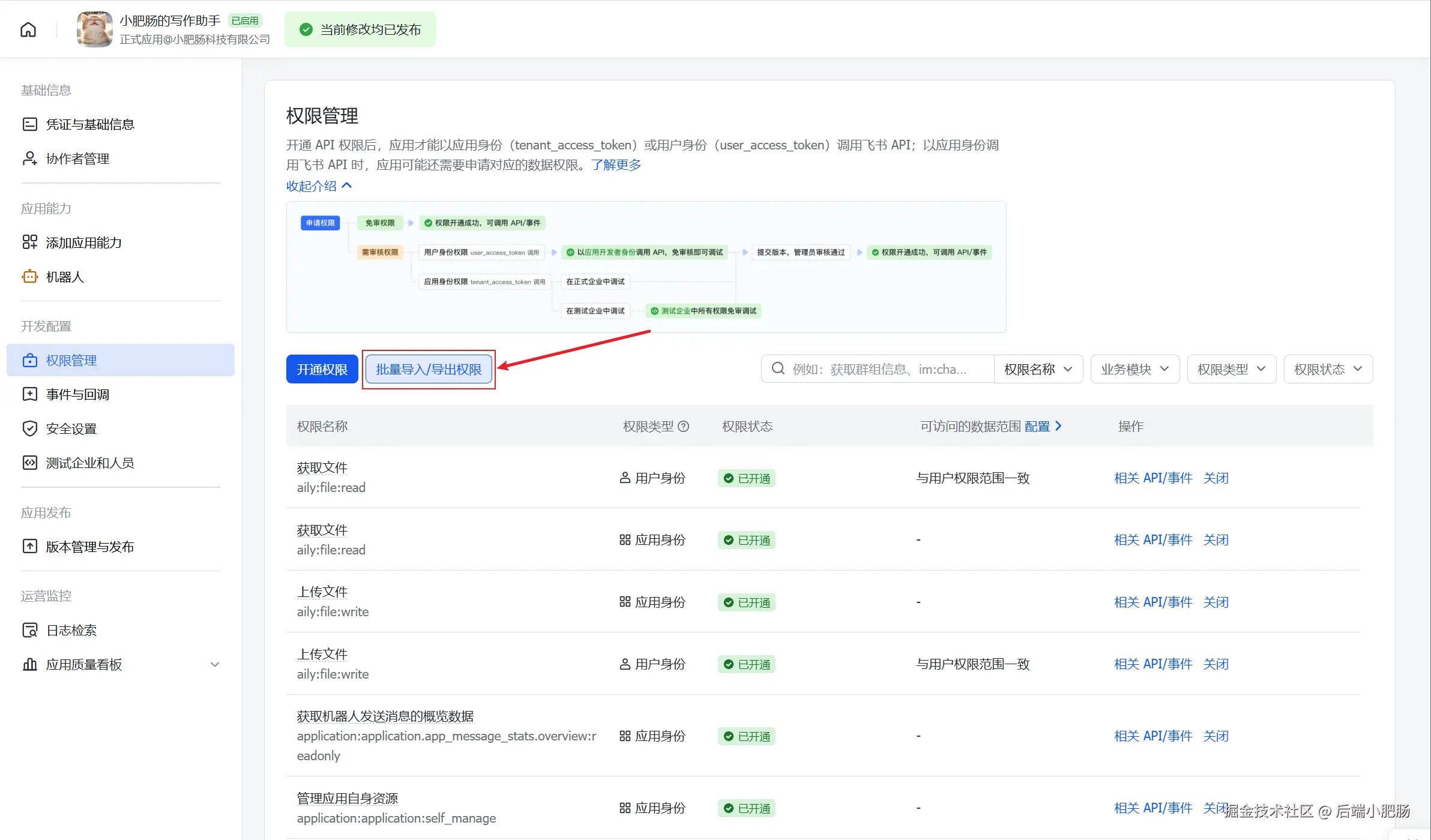 开通应用权限: 进入【权限管理】页面,点击【批量导入/导出权限】。