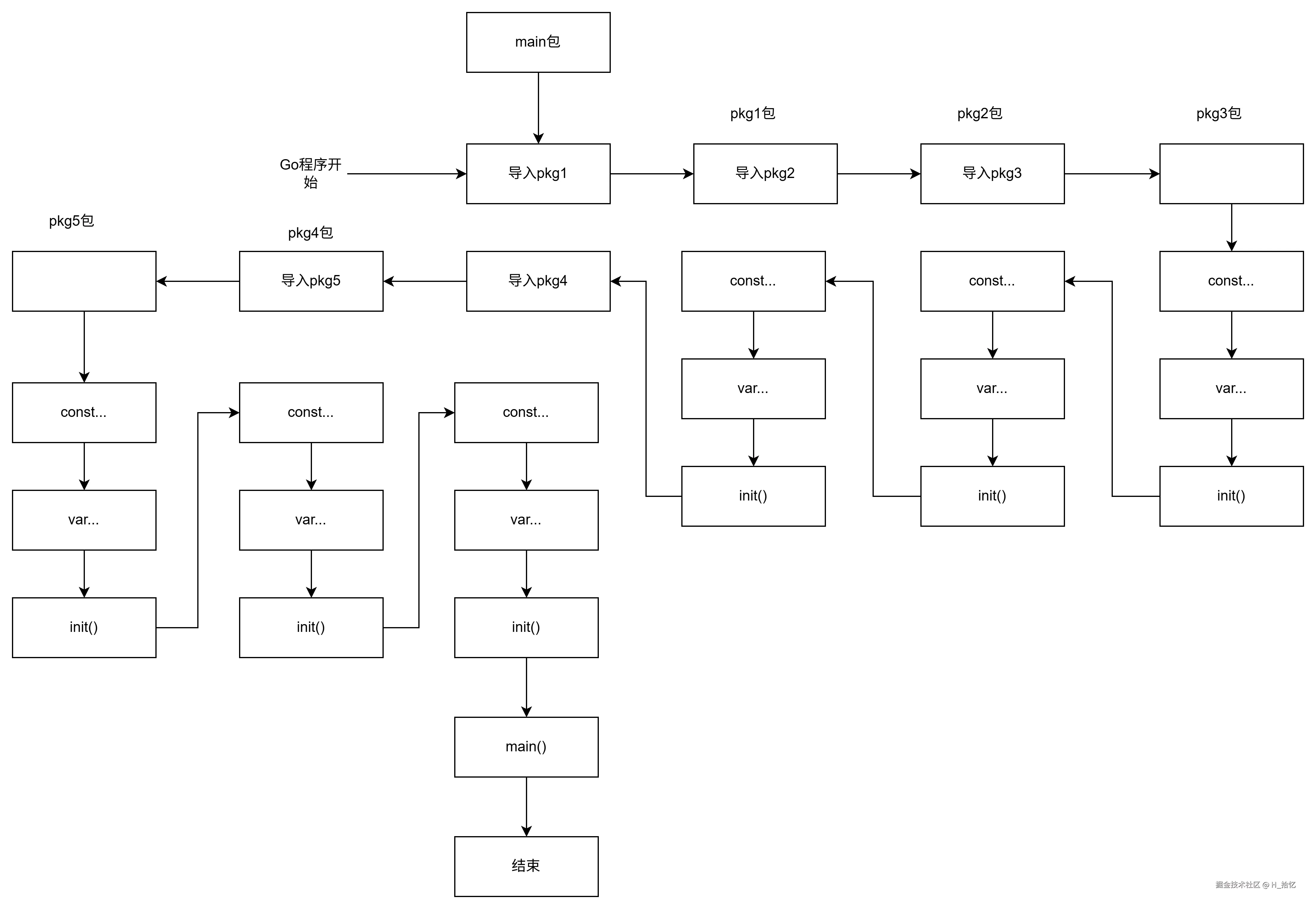 Go程序是由一组包组合而成.程序的初始化就是这些包的初始化.每个Go包都会有自己的依赖包.每个包还包含有常量 变量 init函数等(其中main包有main函数).