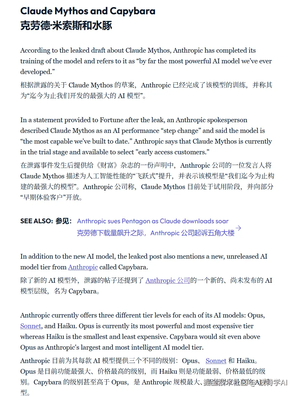 泄露材料里藏着一篇完整的博客草稿,有两个版本,一版叫 Mythos,一版叫 Capybara,内容几乎一样。发言人没否认,直接对 Fortune 说:"这是一次 step change,也是我们迄今构建的最强模型。"