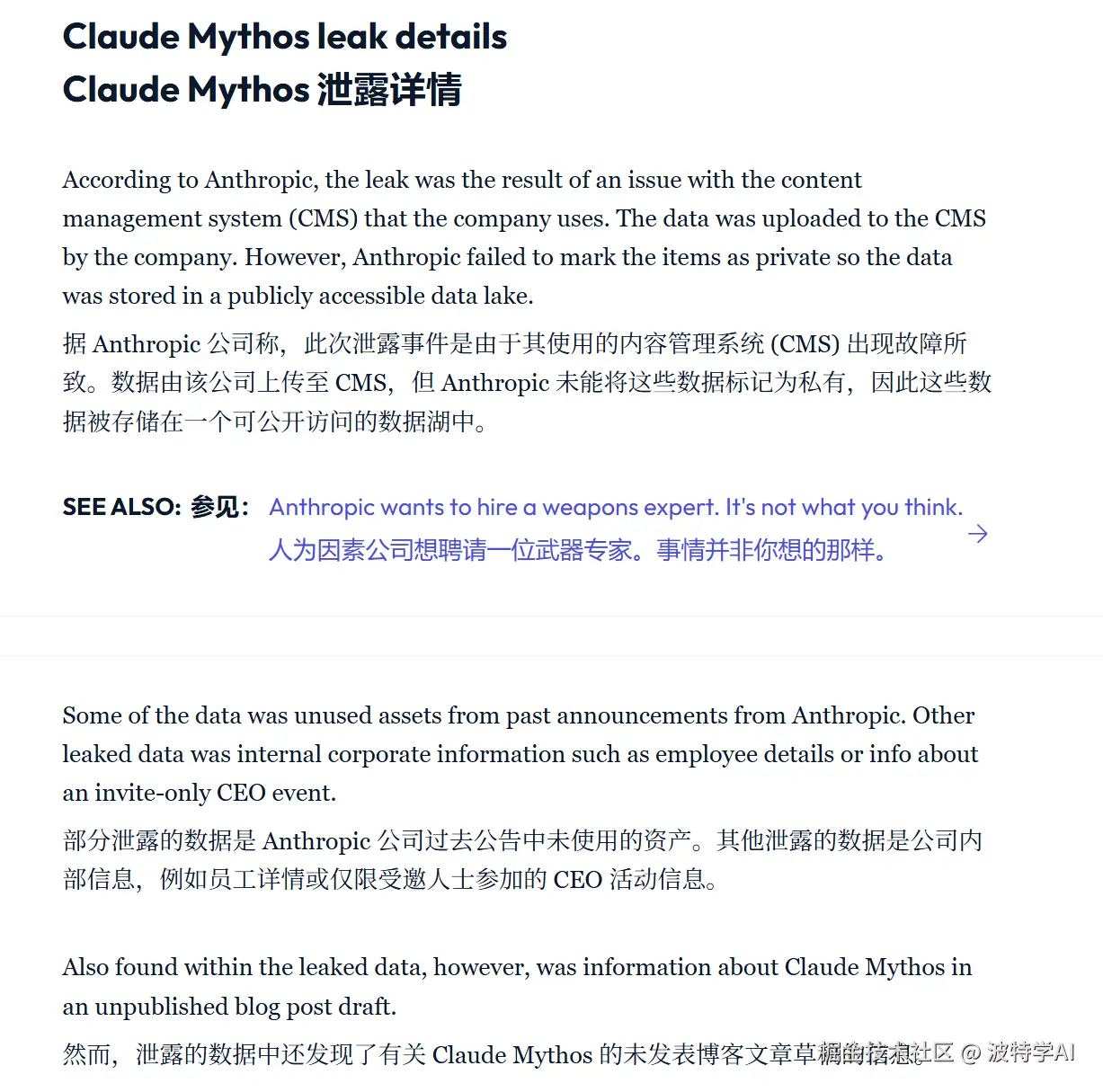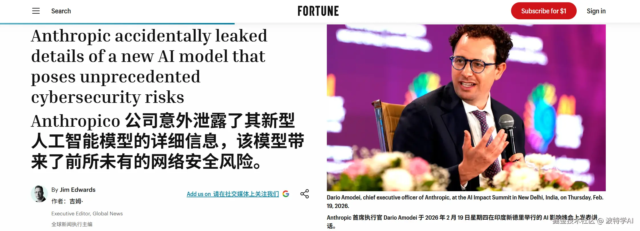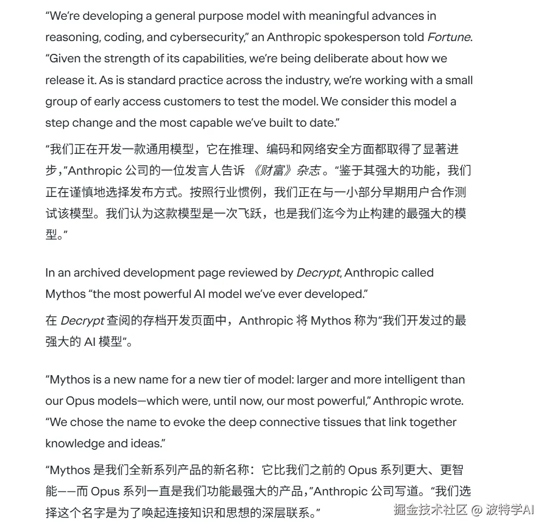 这个模型叫 Claude Mythos。Anthropic 迄今最强的模型。强到他们自己在内部草稿里写:它可能带来前所未有的网络安全风险。