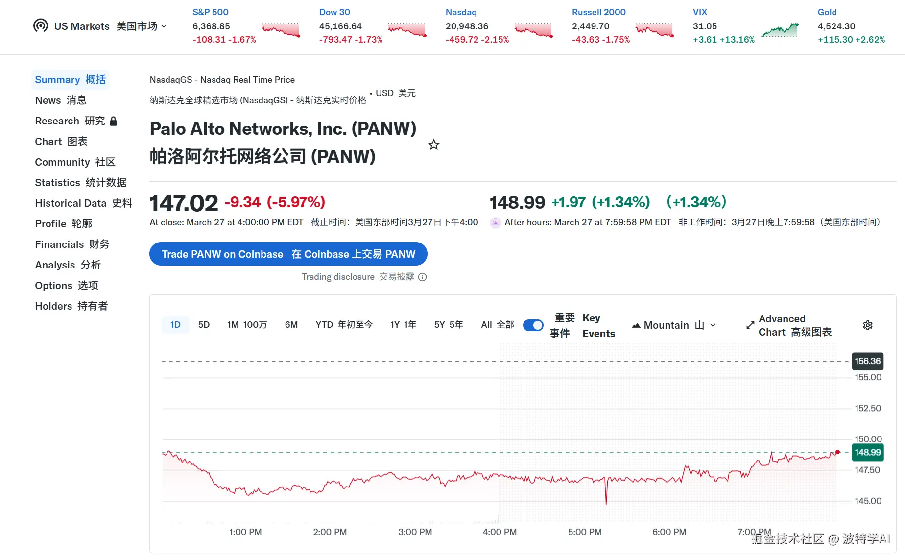 一个还没正式发布的 AI 模型,消息泄露当天,Palo Alto Networks 跌了 7%,CrowdStrike 跌 6.4%,Fortinet、Zscaler 跌了 4% 到 6%。