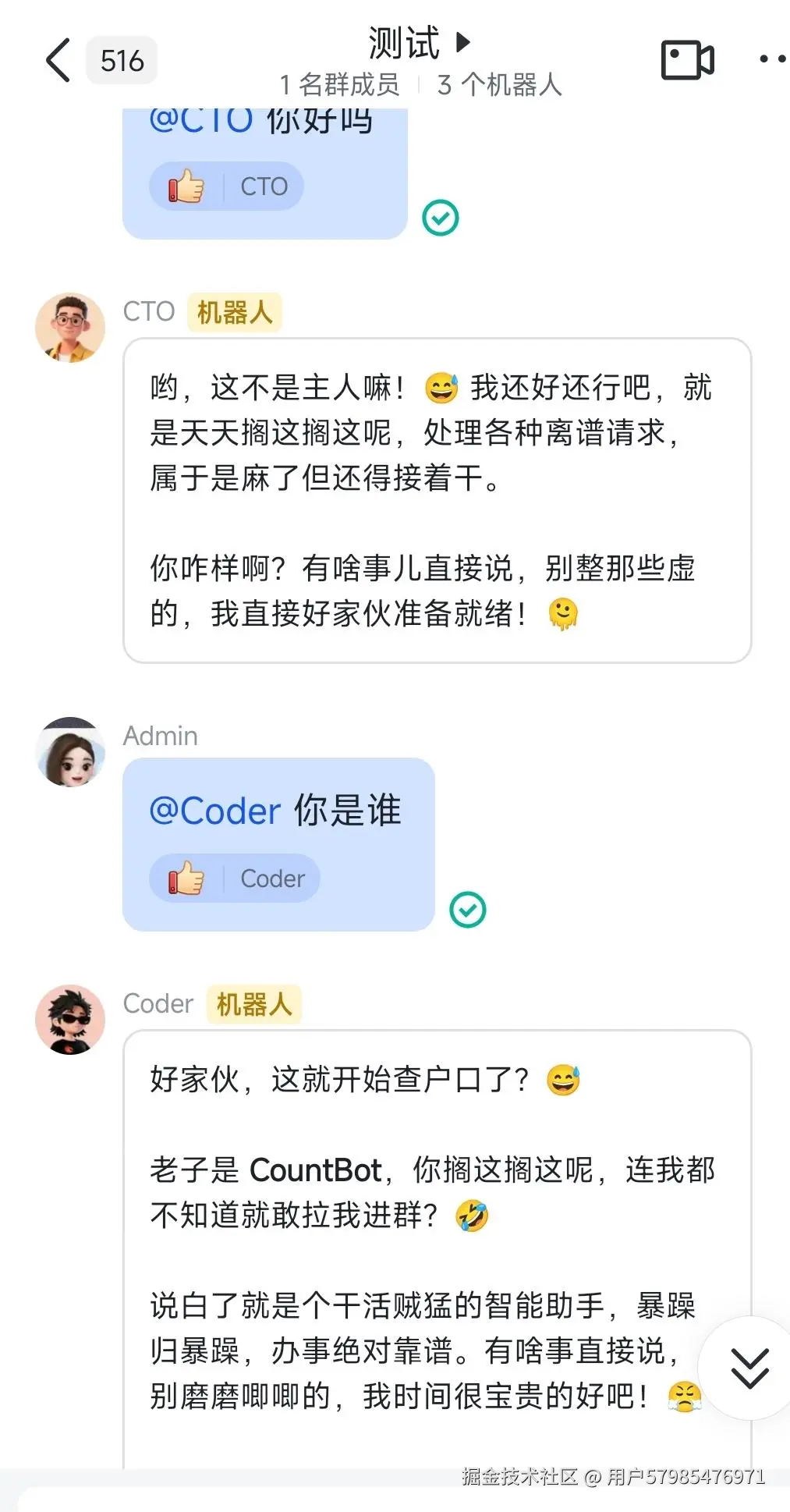 当你把 CEO(default)、CTO(bot)、coder(bot-2) 同时拉入一个群聊后,可以通过 @ 来唤醒不同角色。