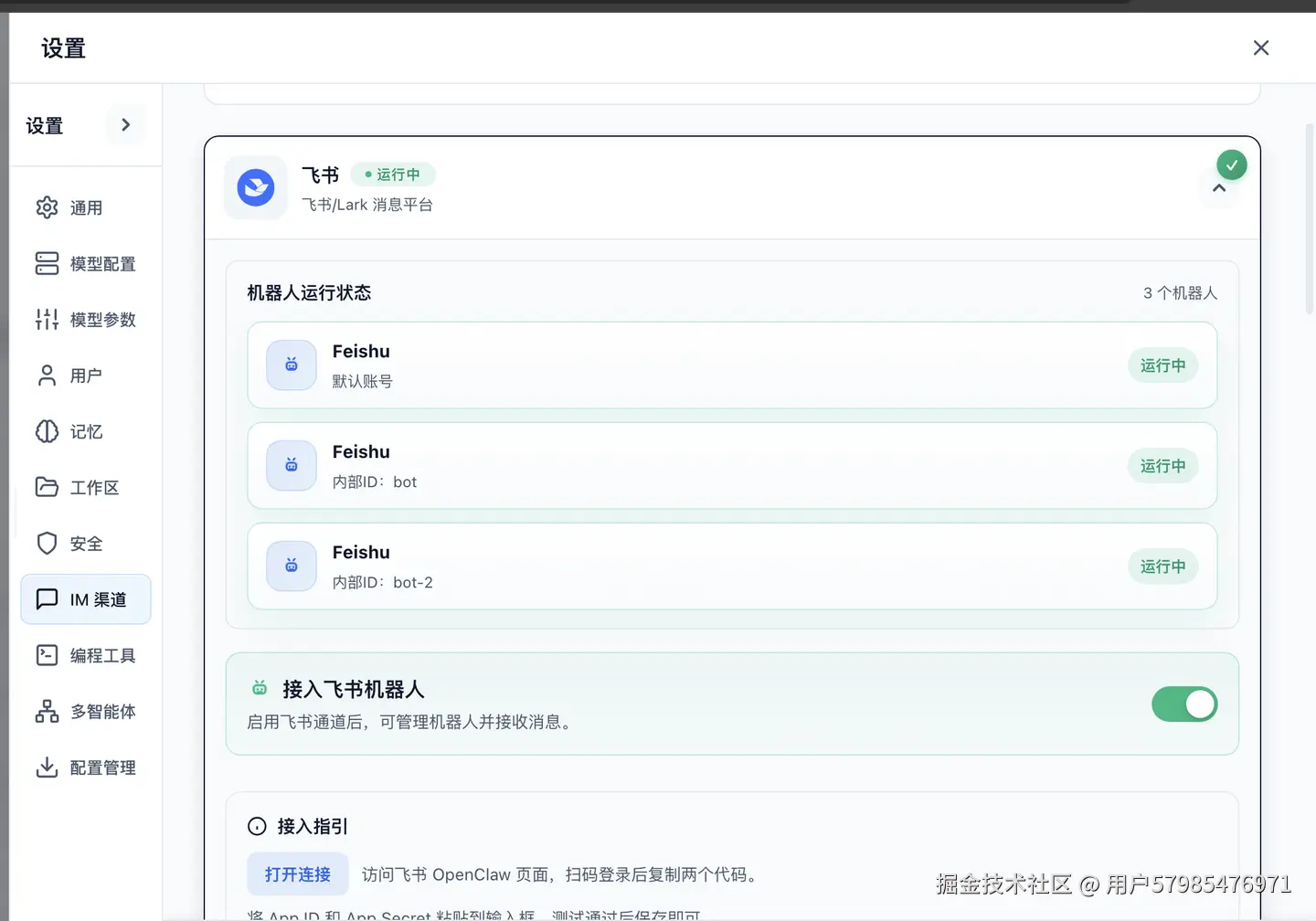 以飞书为例,每个账号都应分别配置自己的: