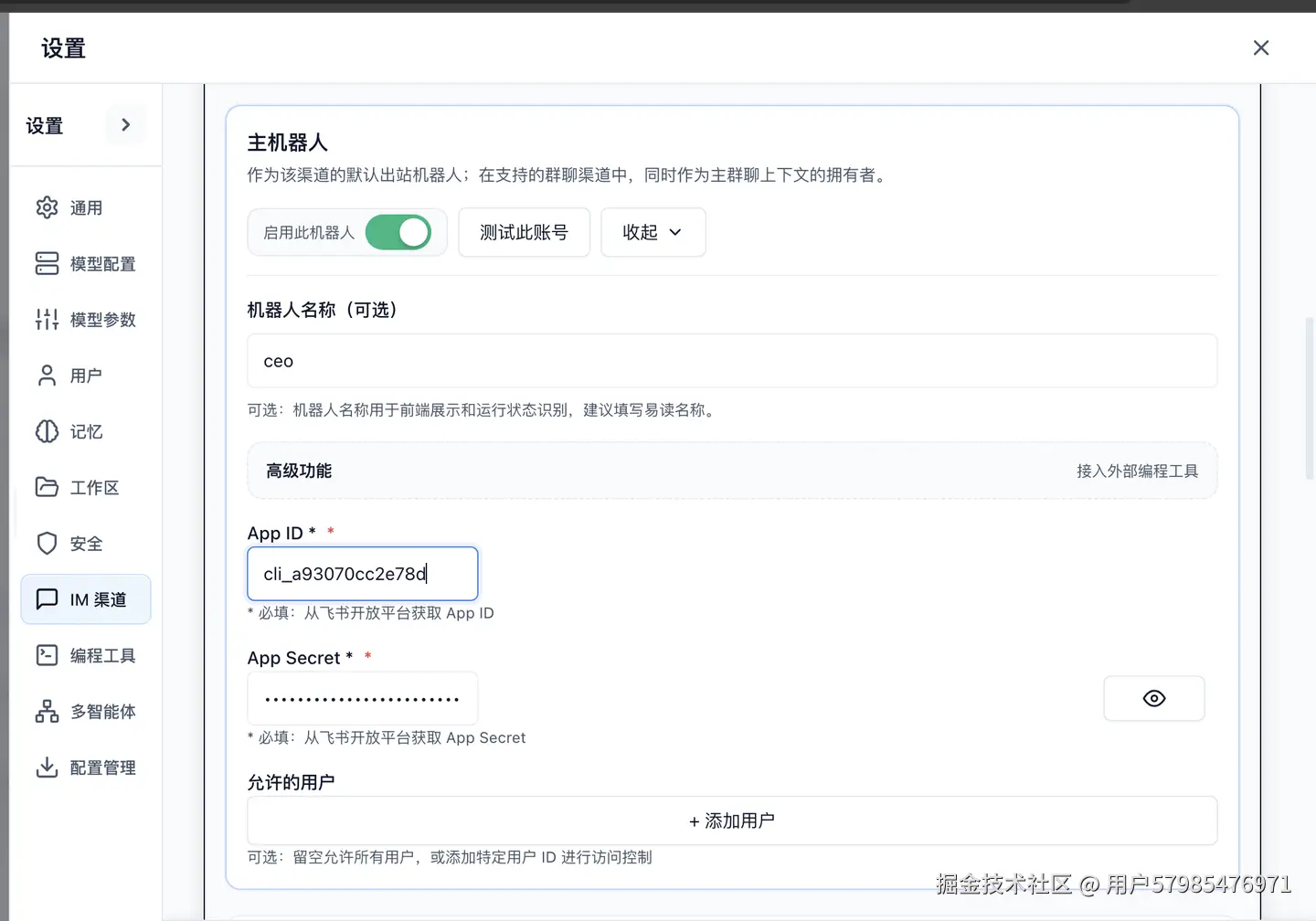 IM 渠道中配置多个机器人账号 - 确保主机器人使用