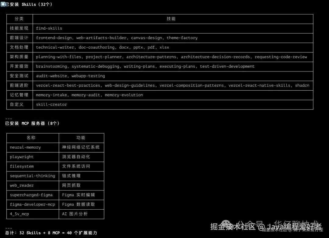这篇文章,我把自己踩了无数坑、亲测稳定可用的 32 个精选技能 + 8 个 MCP 服务器 全部分享给你。一键安装、自动触发,让你的 Claude Code 从「只会补代码的助手」,变成「能帮你搞定全流程的开发搭档」。