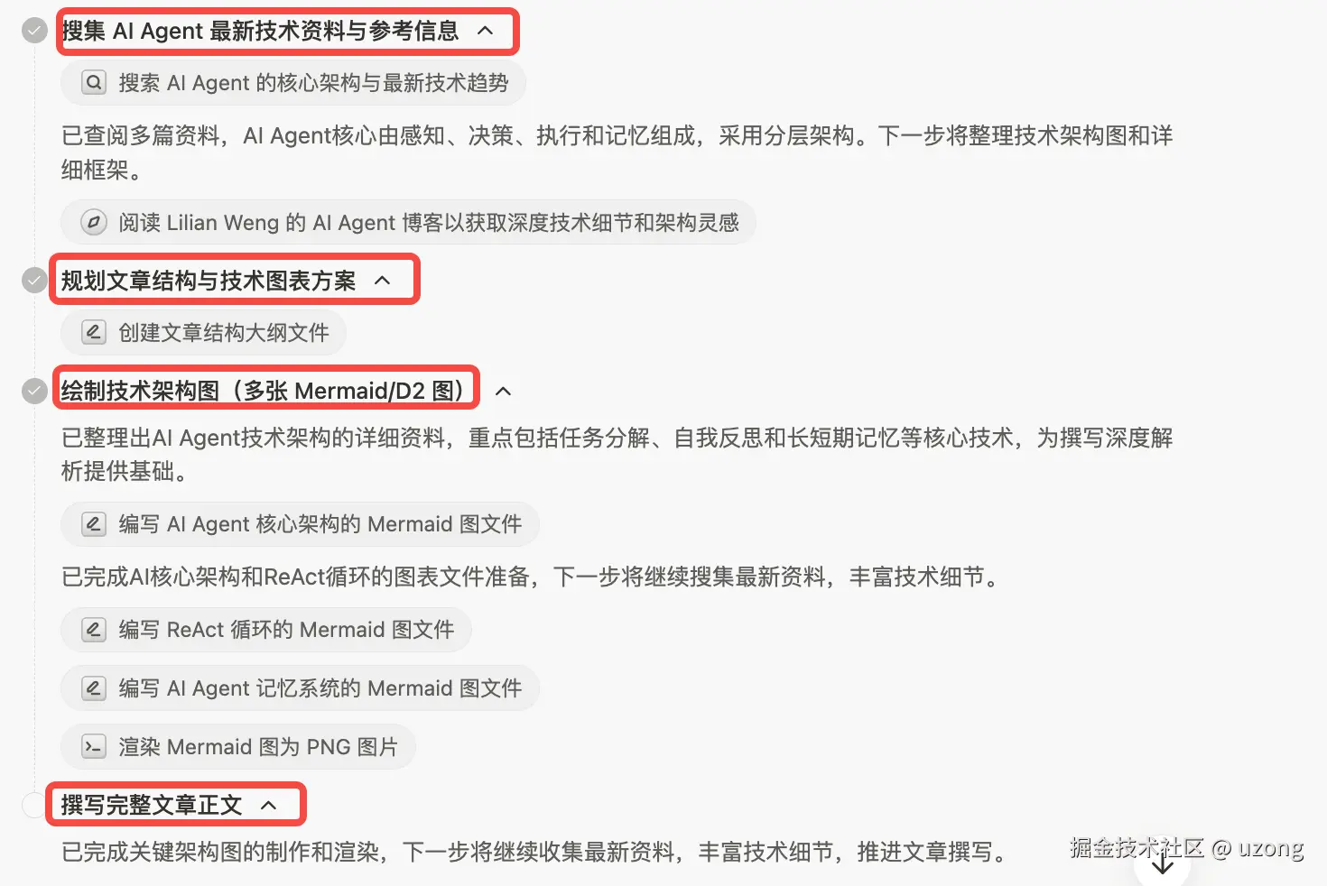比如使用 Manus 写一篇 AI Agent 的技术文章。 Manus像一个助手一样,帮我生成一篇技术文章
