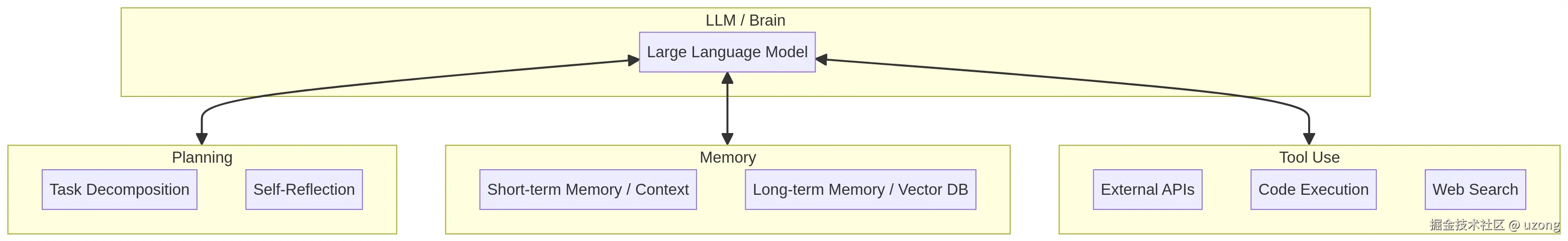一个典型的 AI Agent 系统以大型语言模型(LLM)为核心,并围绕其构建了三个关键组件:规划(Planning)、记忆(Memory)和工具使用(Tool Use) 。这些组件协同工作,使得 Agent 能够理解任务、制定策略、存储信息并与外部世界互动。