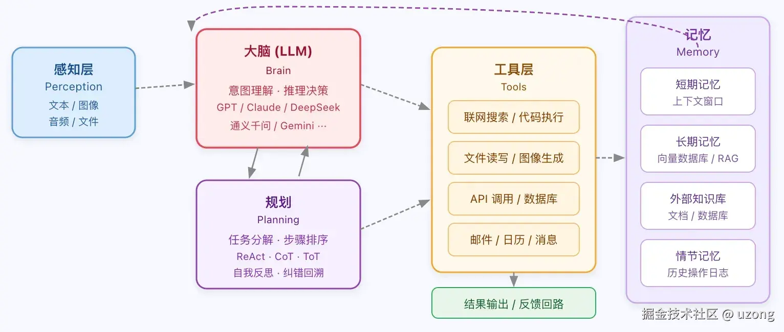 | 记忆 | 管理上下文、存储长期知识 | 向量数据库、RAG、上下文窗口 |