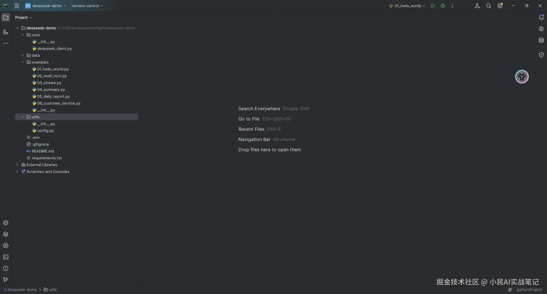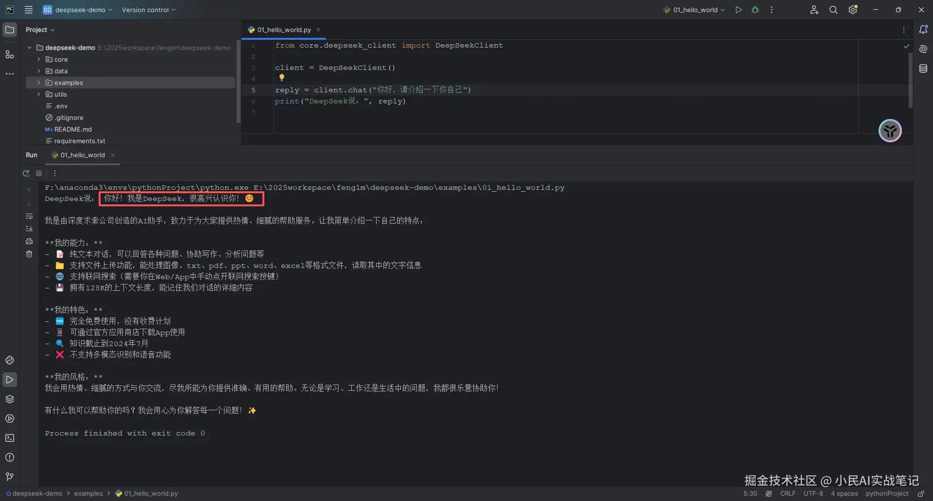 代码写完之后,我在examples/01_hello_world.py里写了一个最简单的调用👇