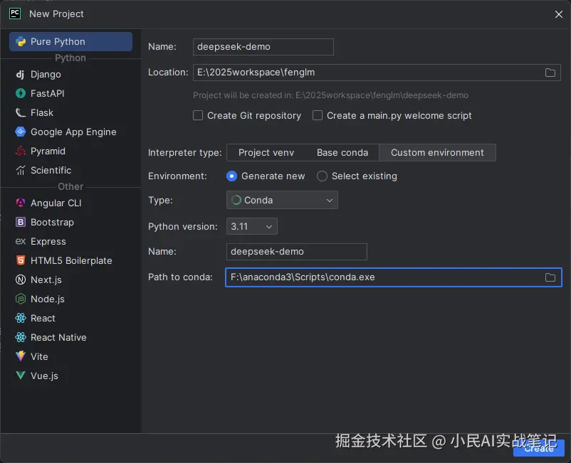 ②设置项目位置,比如D:\projects\deepseek-demo