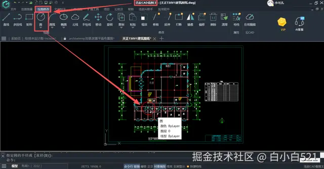 1、在浩辰CAD看图王电脑版中打开需要绘制局部放大图的CAD图纸,在【绘图修改】中选择“圆”,在CAD图纸中用圆功能选中需要局部放大的位置。
