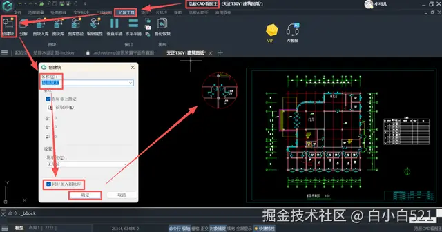 5、把“局部放大图”使用【扩展工具】中的“创建块”功能,创建成块,并勾选“同时加入图块库”。