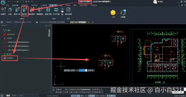 6、加入到图块库后,点击【扩展工具】中的“图块库”就能看到我们加入进来的局部放大图,选中之后,在界面上指定插入点就能直接插入这个局部放大图了。