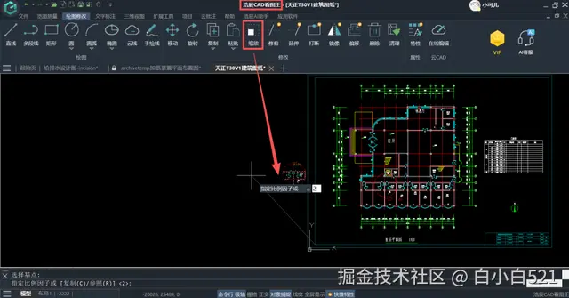 4、选中局部放大部分,选择“缩放”功能,选择一个基点,指定比例因子,比如我们想让其局部放大2倍,就输入2,回车后,该局部放大图就被放大了2倍。