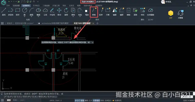 3、选中“圆”使用“修剪”功能,将圆外的部分都修剪干净,并把圆外的其他内容删除掉,剩下的圆内的内容就是我们需要局部放大的部分了。