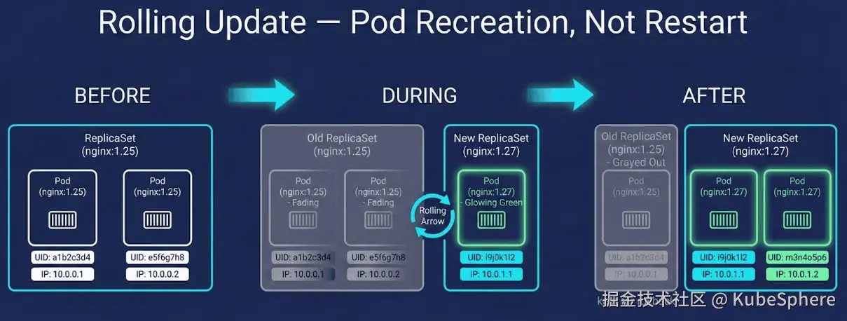 AFTER: Pod UID xxx-yyy, IP 10.244.1.6, nginx:1.27, restarts: 0