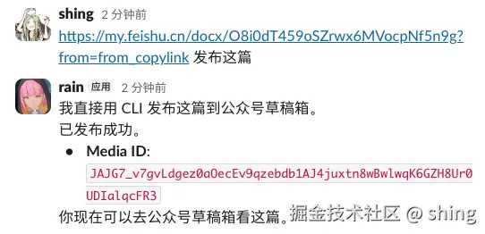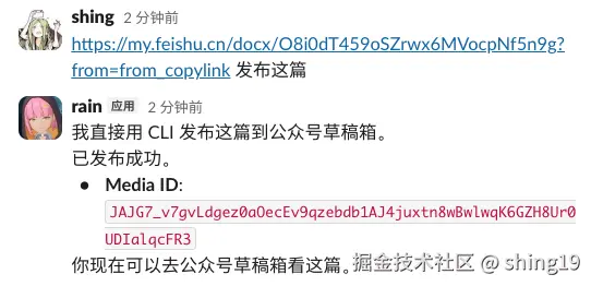 我在 Slack 里跟 Agent 说"发布这篇",丢一个飞书链接过去: