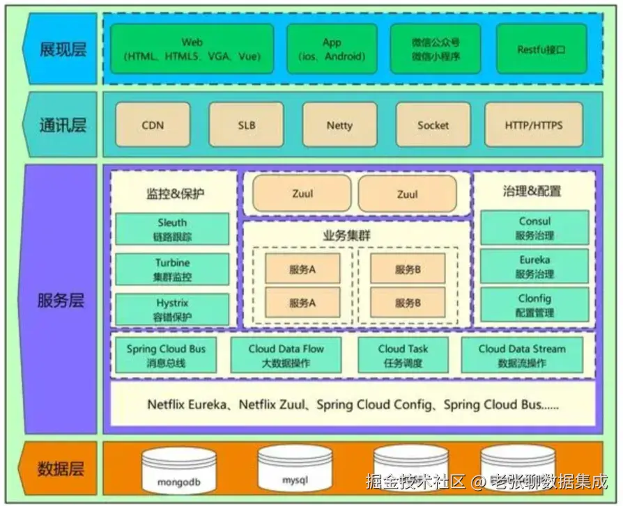 - 技术栈架构。 关注的是在应用开发过程中,存储层、逻辑层、前端展示层分别用什么技术框架、开发语言、中间件。这是开发技术选型的视角。