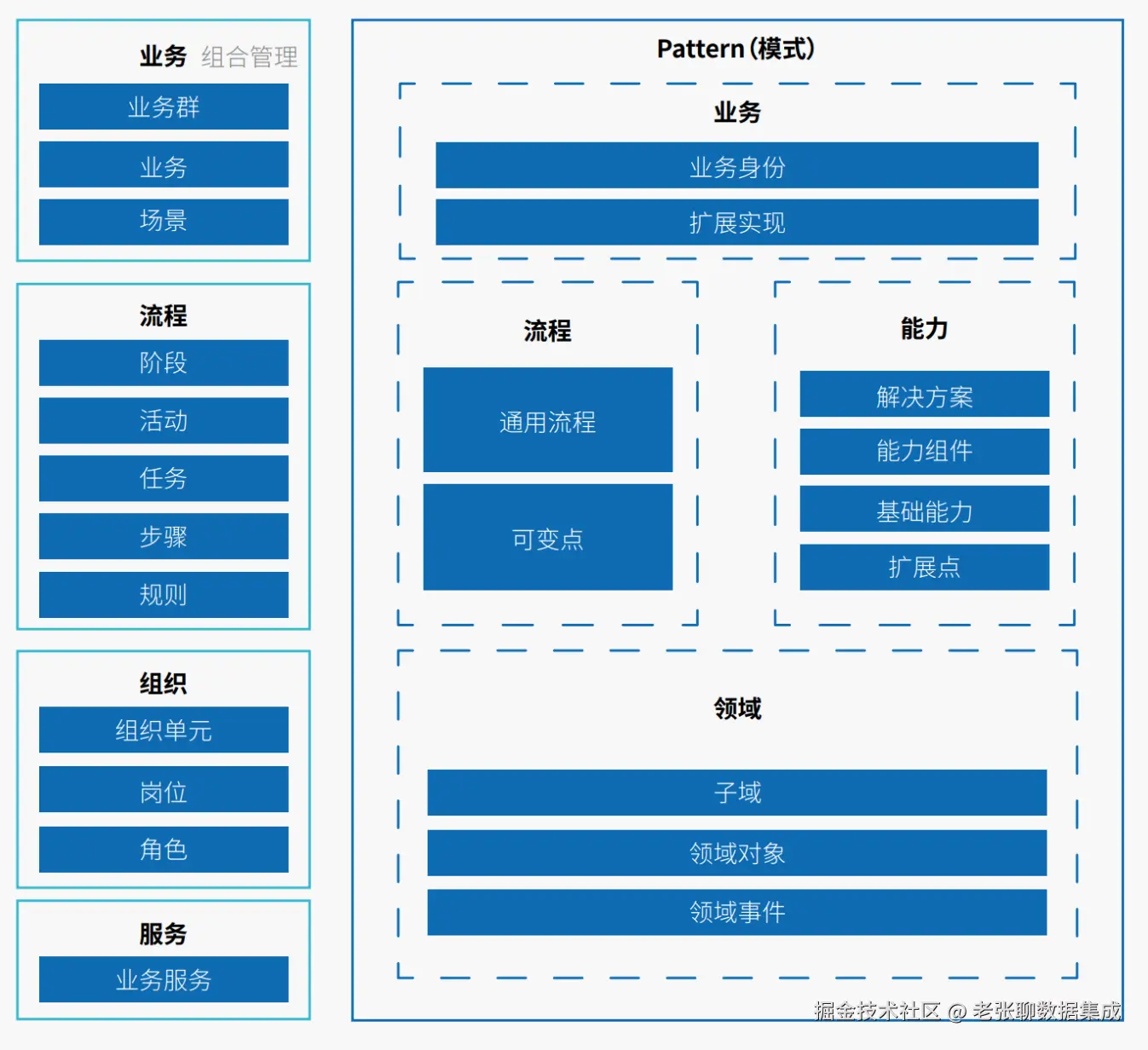 - 数据主题域,就是按照业务价值链划分出来的数据分区。比如人力资源域、财务域、供应链域、市场营销域。每个域里有哪些核心的数据对象,这一步要识别清楚。这个阶段的工作,本质上还是业务建模的范畴。