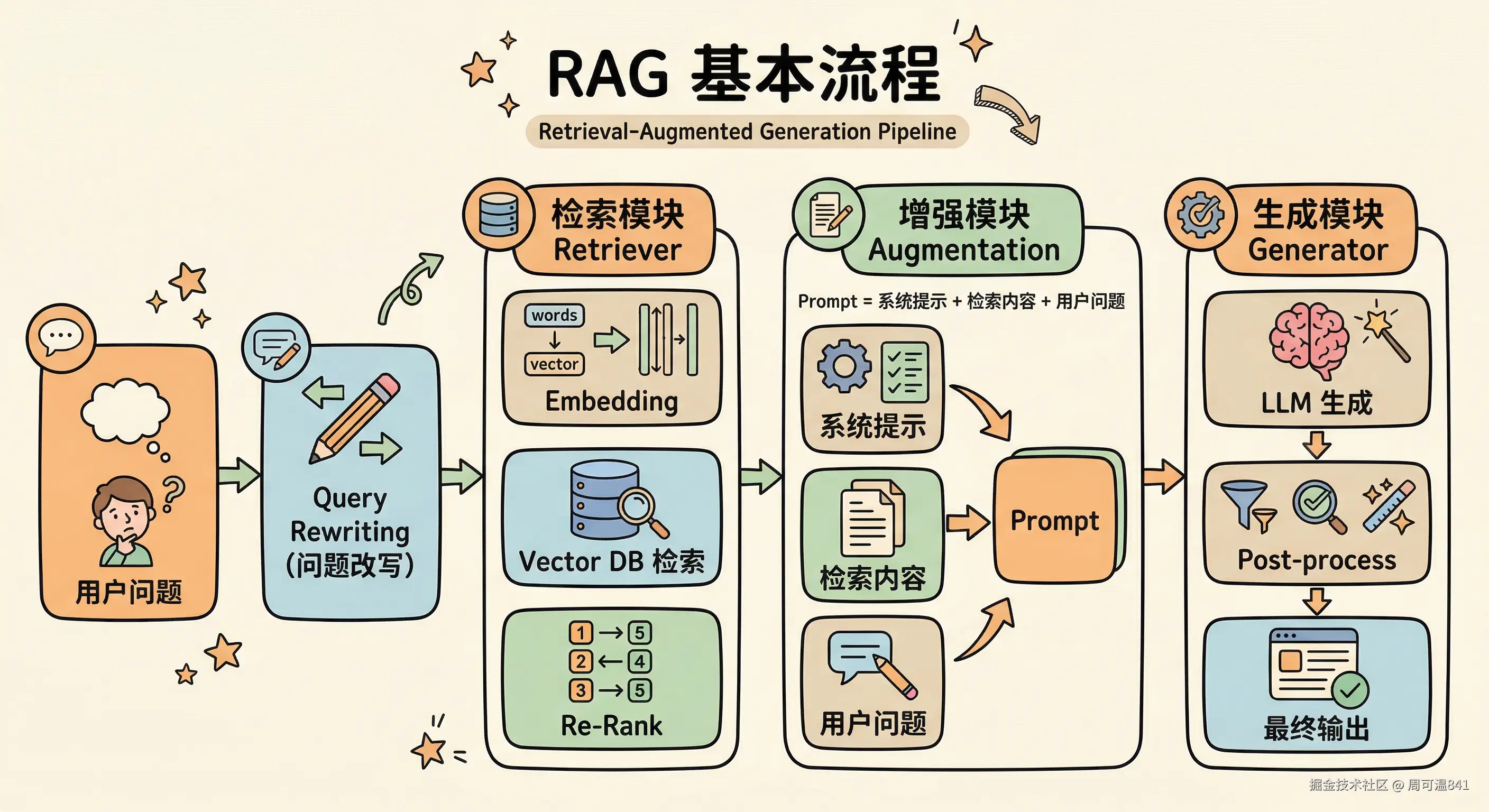 - 大模型生成 (Generation): LLM 接收到这个“开卷考题”,阅读参考资料,总结并生成最终答案。