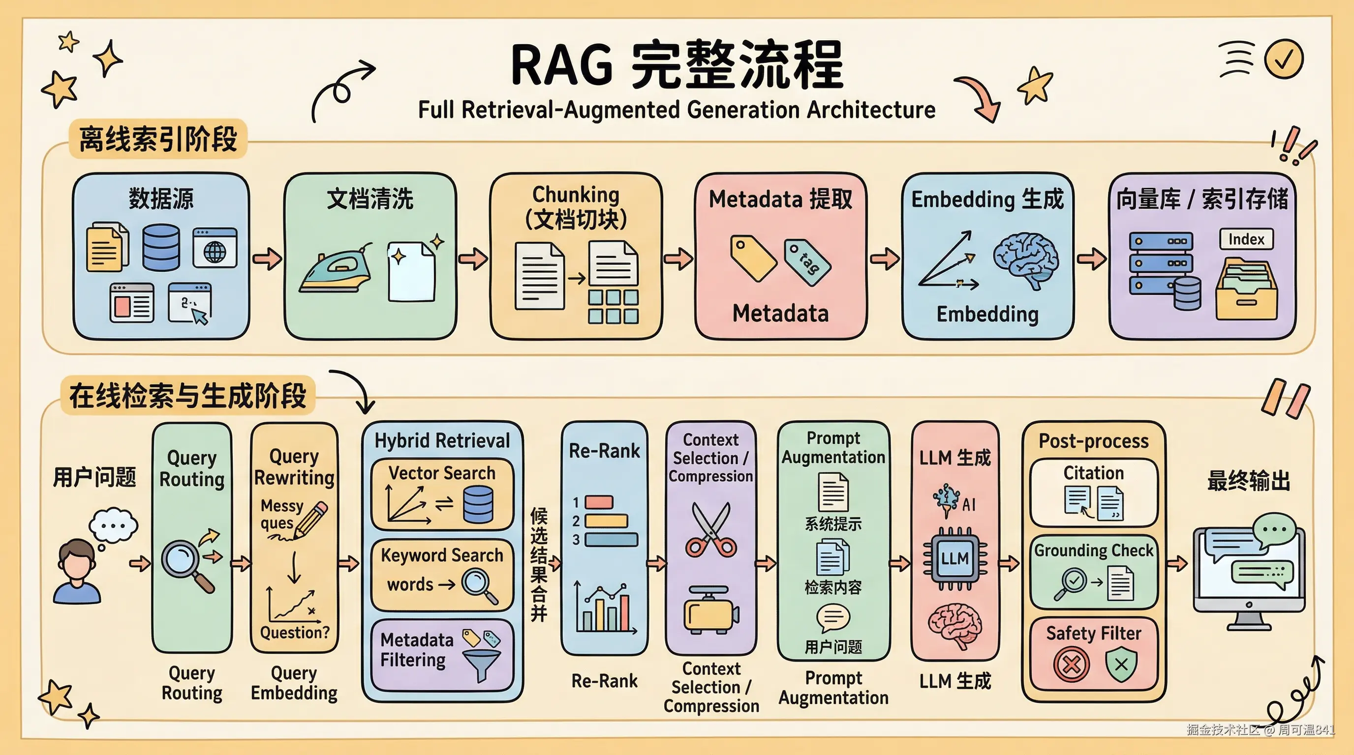 一个标准的 RAG 系统分为离线数据处理和在线检索生成两条链路: