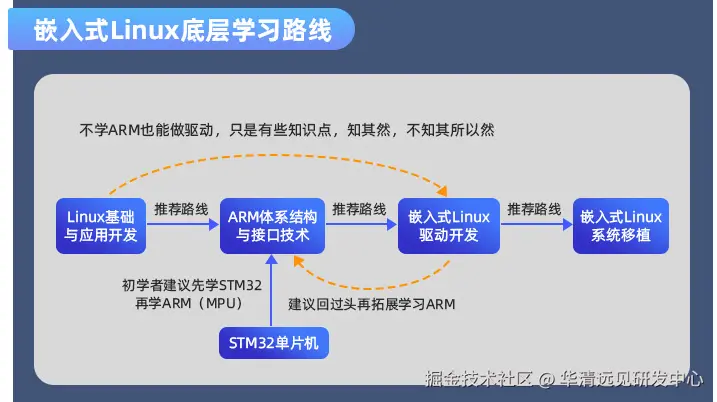 2.嵌入式底层学习路线:Linux基础与应用开发、ARM内核与汇编、Linux驱动开发、Linux系统移植,全体系学习