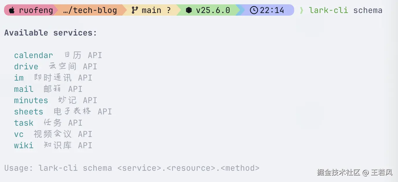 我们看 lark-cli支持哪些 schema,lark-cli schema 是飞书 CLI 工具的一个子命令,用于查看飞书 API 的 Schema 定义(即数据结构和接口规范)。
