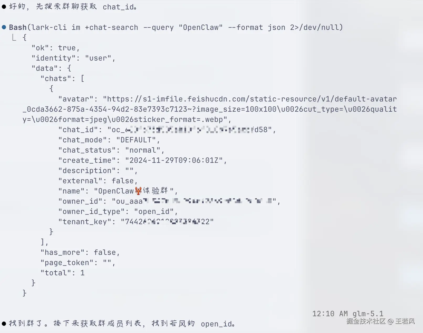 通过 lark-cli im chat.members get 尝试几次报错