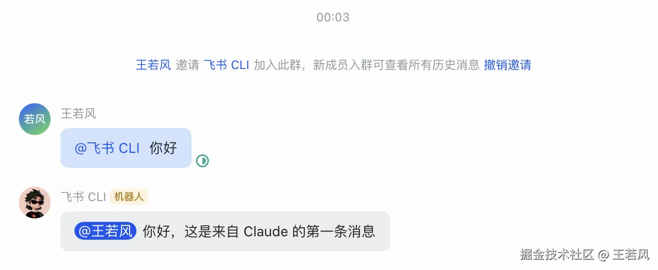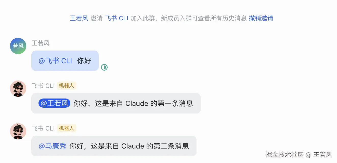 然后就可以在群里通过 CLI 以“飞书 CLI”机器人的身份给群里的人发消息了,下面测试一下。