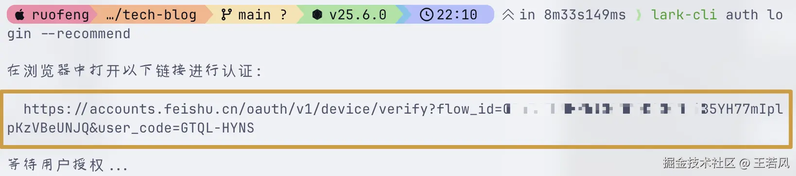 在后台运行此命令。它将输出一个授权 URL——提取该 URL 并将其发送给用户。用户在浏览器中完成设置后,该命令将自动退出。