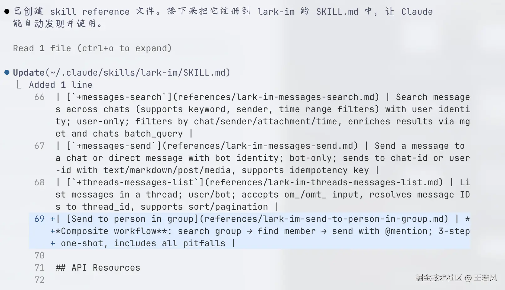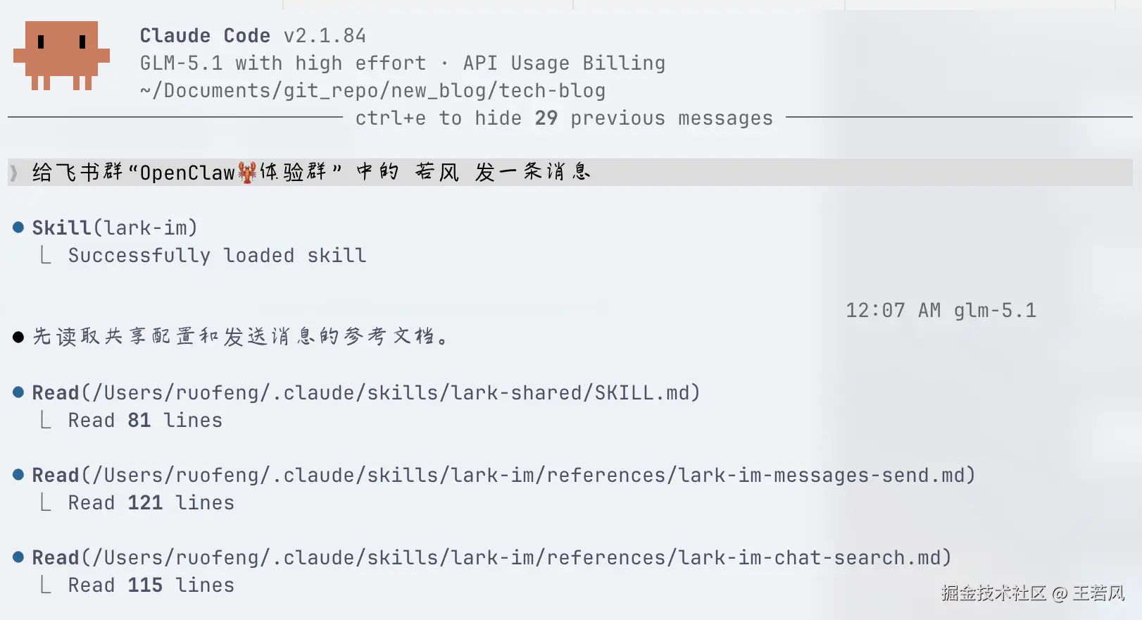 一会就创建完成,它直接更新了官方的 lark-im skill