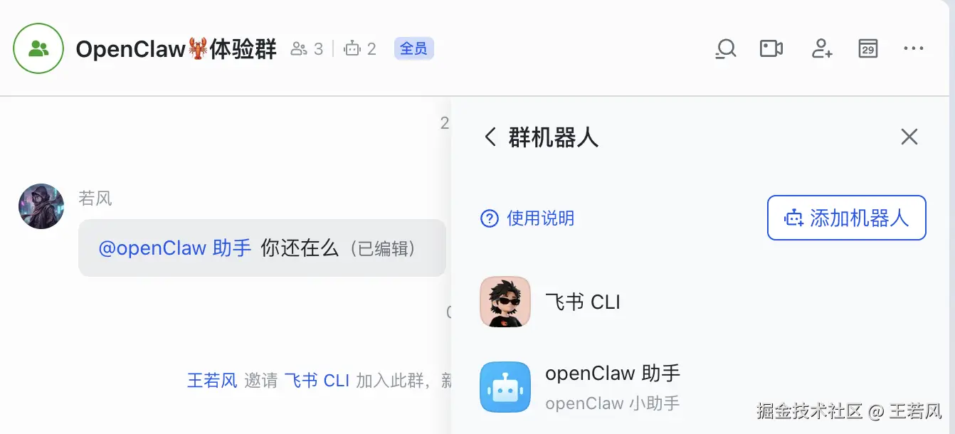 创建一个企业账号,不用认证,至少添加2个好友,就可以创建群聊了,我这里以前玩 Openclaw 的时候创建好了,直接拿过来用一下,将“飞书 CLI”机器人拉入到群聊中。