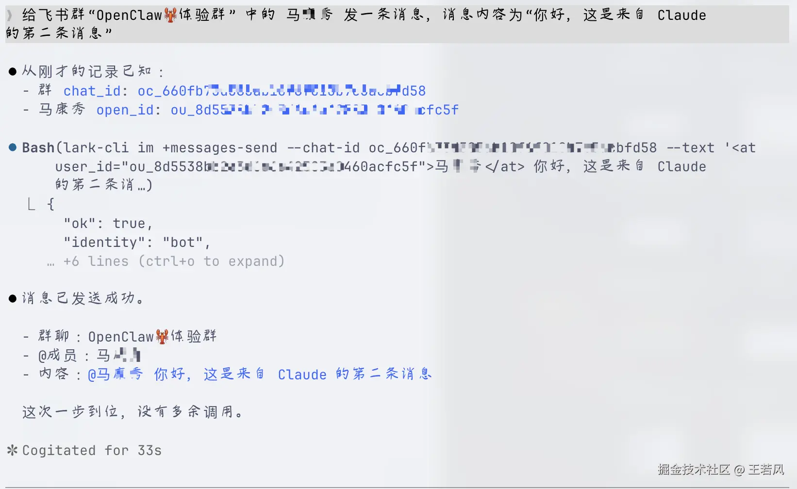 user_id="ou_5bd55b3e3cb1516a41922dxxxx">若风</at> 你好,这是来自 Claude