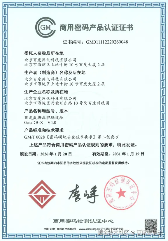 近日,百度智能云自研的关系型数据库GaiaDB分布式版获得由国家密码管理局商用密码检测认证中心颁发的《商用密码产品认证证书》,通过GM/T 0028《密码模块安全技术要求》安全等级第二级认证。这一认证标志着GaiaDB分布式版密码模块在密码安全设计、密钥管理机制、硬件集成能力及整体安全体系方面,已达到国家商用密码产品规范要求,为金融、政务及关键行业的安全建设提供了权威保障。